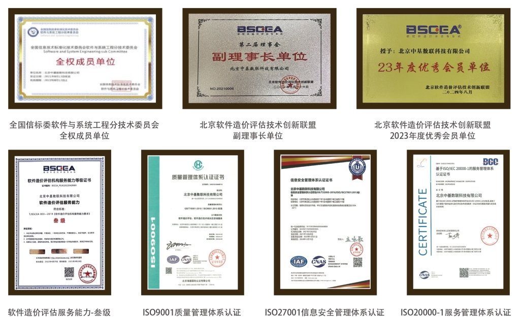中基數(shù)聯(lián)始終堅(jiān)持不斷提升自身競爭優(yōu)勢,憑借卓越的企業(yè)實(shí)力和可靠的服務(wù)質(zhì)量,獲得北京軟件造價(jià)評估技術(shù)聯(lián)盟副理事長單位、國家高新技術(shù)企業(yè)、中關(guān)村高新技術(shù)企業(yè)、AAA級信用企業(yè)、全國信標(biāo)委全權(quán)成員單位等榮譽(yù)資質(zhì),并具備信息技術(shù)服務(wù)管理體系、質(zhì)量管理體系、信息安全管理體系等多項(xiàng)國際管理體系認(rèn)證,擁有信息化造價(jià)評估領(lǐng)域軟件著作權(quán)數(shù)十項(xiàng),并成為國內(nèi)目前唯一具備“軟件造價(jià)評估服務(wù)能力等級-三級”(最高級)資質(zhì)的服務(wù)商。