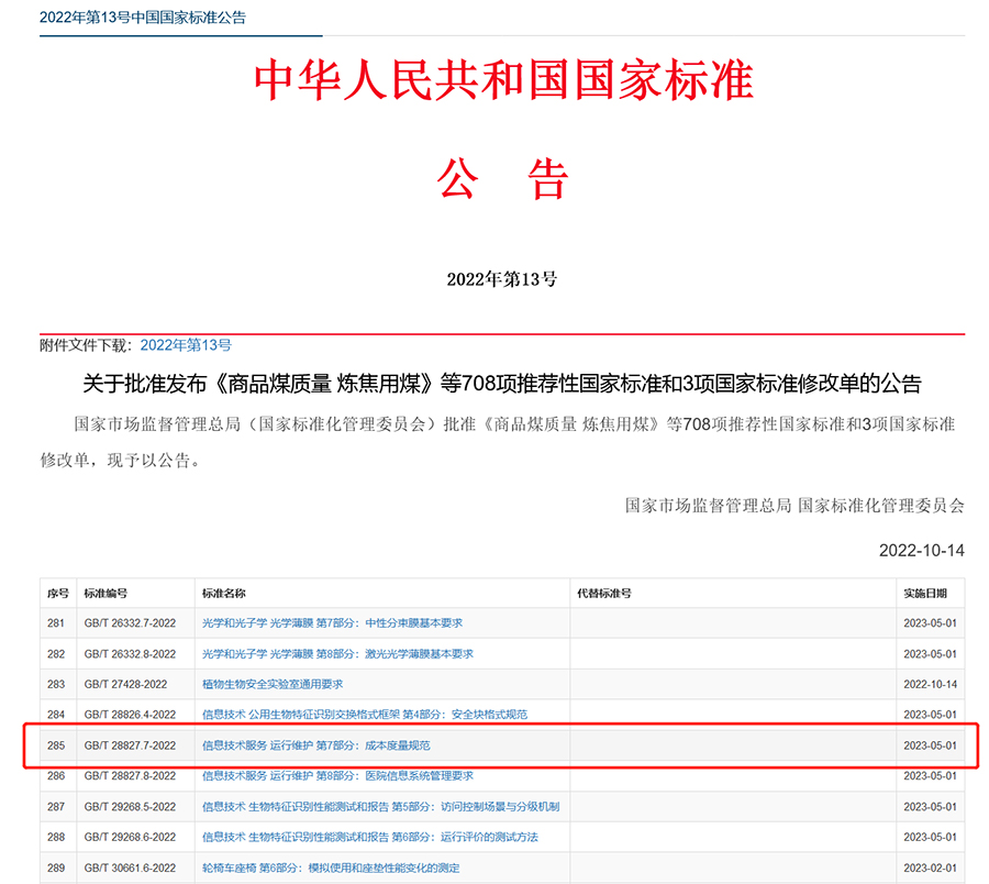 國家市場監(jiān)督管理總局 國家標(biāo)準(zhǔn)化管理委員會于2022年10月14日發(fā)布2022年第13號中國國家標(biāo)準(zhǔn)公告,批準(zhǔn)《信息技術(shù)服務(wù) 運(yùn)行維護(hù) 第7部分:成本度量規(guī)范》國家標(biāo)準(zhǔn)正式發(fā)布,標(biāo)準(zhǔn)號為GB/T 28827.7-2022,2023年5月1日開始實(shí)施。