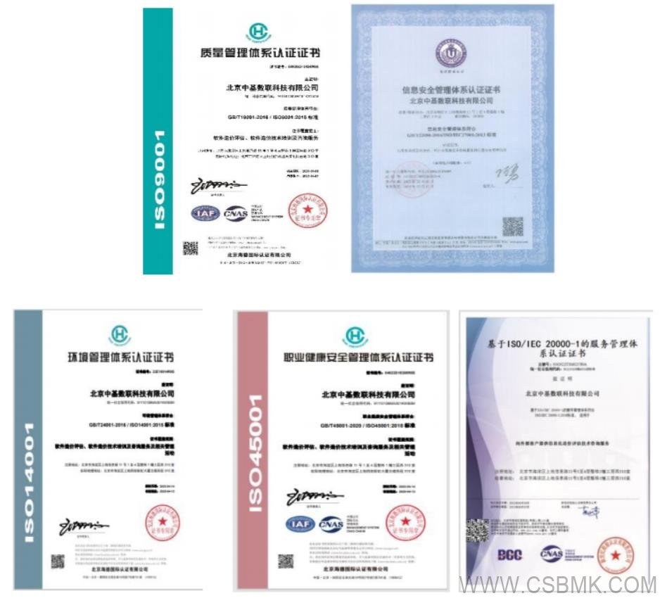 伴隨業(yè)務(wù)發(fā)展及服務(wù)集約化的提升,北京中基數科技有限司(以下簡(jiǎn)稱(chēng)“我司”)對自身經(jīng)營(yíng)管理提出更高要求,2022年6月6日,我司通過(guò)了ISO2000的體系認證,至此為止,我司已經(jīng)陸續獲得了質(zhì)量、信息安全、環(huán)境、職業(yè)健康安全及信息技術(shù)服務(wù)管理體系認證,成為ISO五項體系認證通過(guò)的信息化造價(jià)評估專(zhuān)業(yè)咨詢(xún)機構。