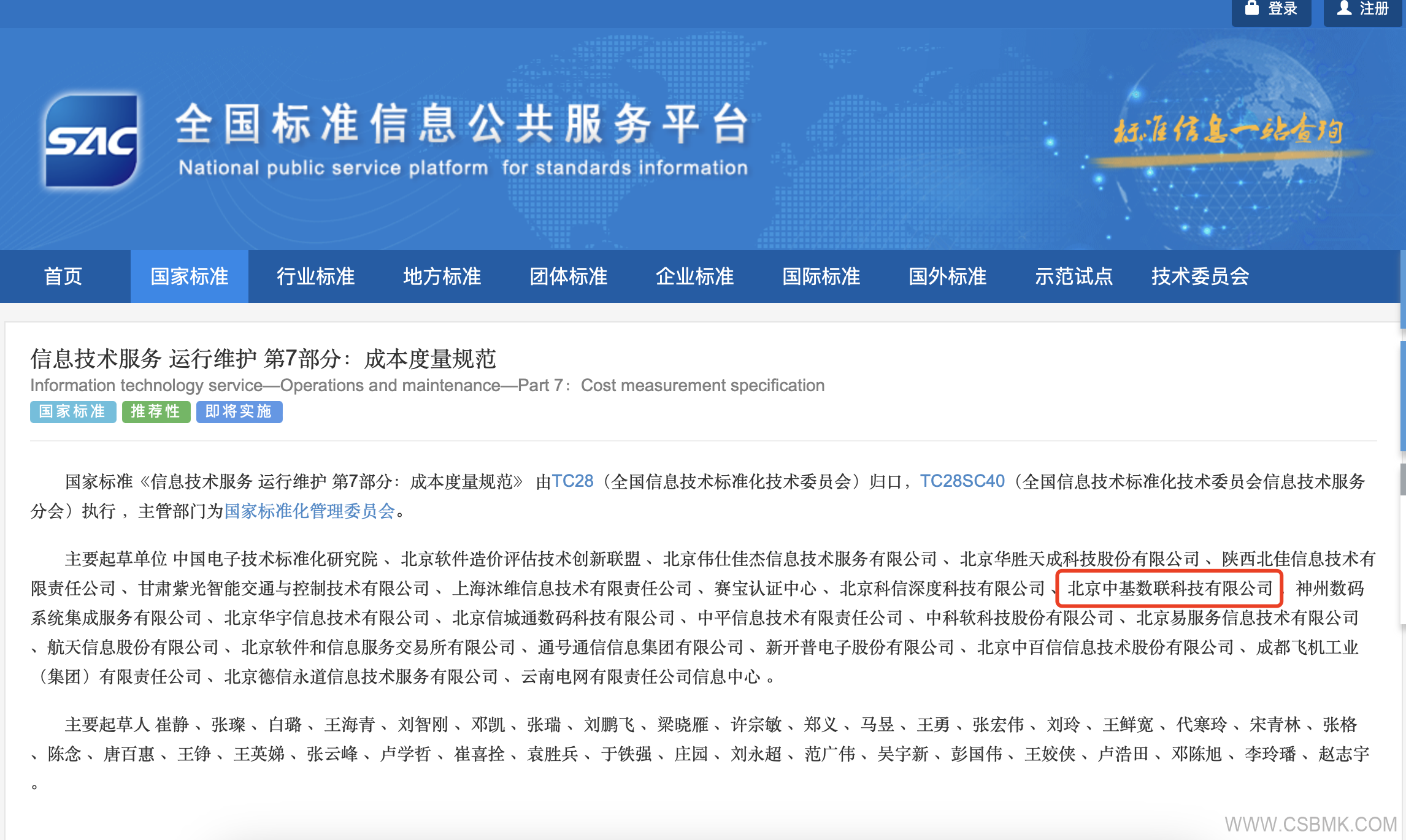 2022年10月12日,國家市場(chǎng)監督管理總局(國家標準化管理委員會(huì ))發(fā)布《中華人民共和國國家標準公告(2022年第13號)》,批準《信息技術(shù)服務(wù) 運行維護 第7部分:成本度量規范》(標準號:GB/T 28827.7-2022)國家標準正式發(fā)布,實(shí)施日期為2023年5月1日。此標準由中國電子技術(shù)標準化研究院、北京軟件造價(jià)評估技術(shù)創(chuàng )新聯(lián)盟牽頭,北京中基數聯(lián)科技有限公司(簡(jiǎn)稱(chēng)中基數聯(lián))等24家單位共同參與起草完成。