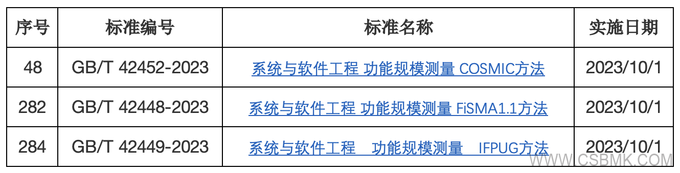 3、GB/T 42449-2023《系統與軟件工程 功能規模測量 IFPUG方法》規定了IFPUG功能規模測量方法的定義、規則和步驟,適用于所有的功能領(lǐng)域和任何有需要測量功能規模的用戶(hù)。