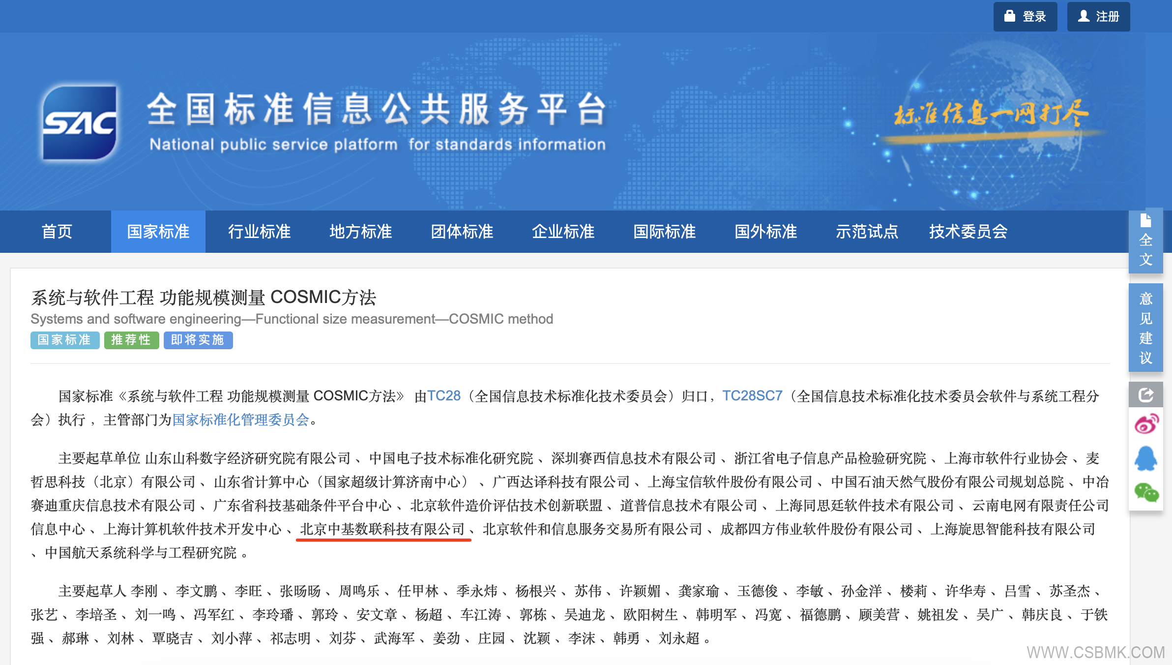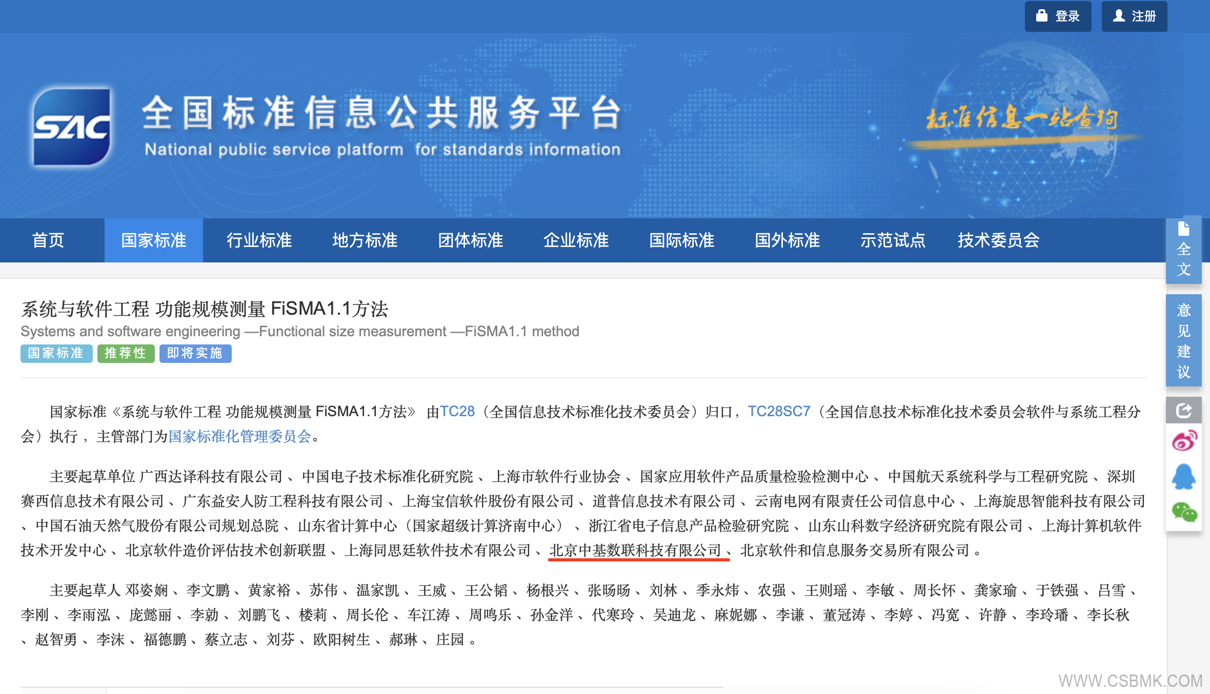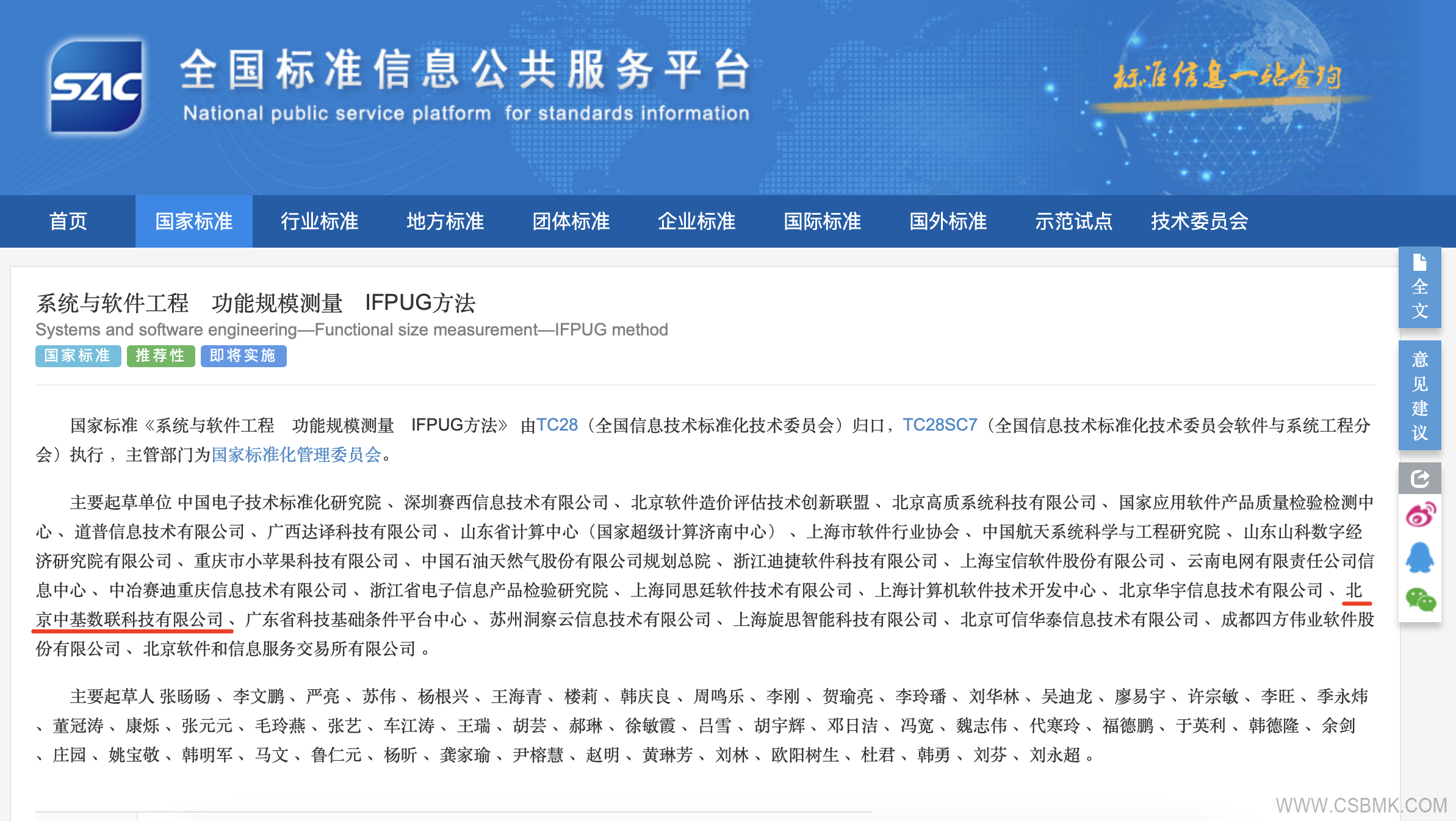 2023年3月17日,國家市場(chǎng)監督管理總局(國家標準化管理委員會(huì ))發(fā)布了2023年第1號華人民共和國國家標準公告。北京中基數聯(lián)科技有限公司參編的3項功能規模測量國家標準正式獲批發(fā)布,系統與軟件工程功能規模測品FiSMA11方法、IFPUG方法和COSNIC方法三項標準將于2023年10月1日正式實(shí)施。