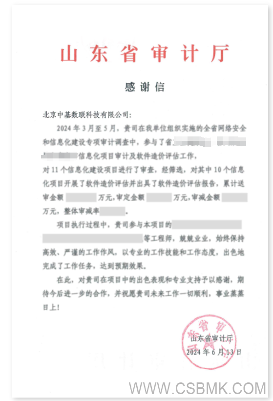 對此,山東省審計廳特發(fā)來感謝信,對我公司在本次專項審計中做出的專業(yè)支持和貢獻表示衷心感謝,并期待雙方未來繼續(xù)保持緊密合作,為推動山東省信息化建設項目審計和核價工作發(fā)展提供強有力的技術(shù)保障。感謝信既是對我們的認可,也是我們不斷前進超越自我的動力,中基數(shù)聯(lián)公司將一如既往秉承“客戶為先、誠實守信、協(xié)作包容、追求卓越”的價值觀,專注在信息化造價評估、審計領(lǐng)域,勇往直前,為客戶提供更優(yōu)質(zhì)的產(chǎn)品和服務。