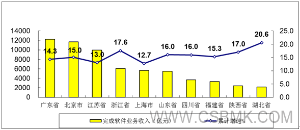主要軟件大省保持穩中向好態(tài)勢,部分中西部省市快速增長(cháng)。軟件業(yè)務(wù)收入居前5名的廣東、北京、江蘇、浙江、上海共完成收入45623億元,占全國軟件業(yè)比重的63.6%。軟件業(yè)務(wù)收入增速高于全國平均水平的省市有16個(gè),其中增速高于20%的省份集中在中西部地區,包括廣西、云南、貴州、寧夏、安徽、江西、湖南等省份。
