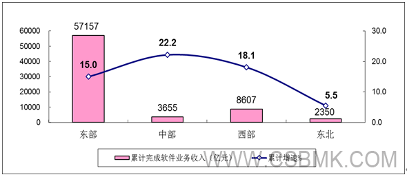 東部地區穩步發(fā)展,中西部地區軟件業(yè)加快增長(cháng)。2019年,東部地區完成軟件業(yè)務(wù)收入57157億元,同比增長(cháng)15.0%,占全國軟件業(yè)的比重為79.6%。中部和西部地區完成軟件業(yè)務(wù)收入分別為3655億元和8607億元,同比增長(cháng)22.2%和18.1%;占全國軟件業(yè)的比重為5.1%和12.0%,比上年提高0.1個(gè)和0.6個(gè)百分點(diǎn)。東北地區完成軟件業(yè)務(wù)收入2350億元,同比增長(cháng)5.5個(gè)百分點(diǎn),占全國軟件業(yè)的比重為3.3%。