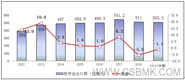 軟件出口形勢低迷。2019年,全國軟件和信息技術(shù)服務(wù)業(yè)實(shí)現出口505.3億美元,同比下降1.1%。