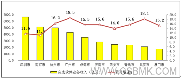 圖9 2019年前十位中心城市軟件業(yè)務(wù)收入增長(cháng)情況