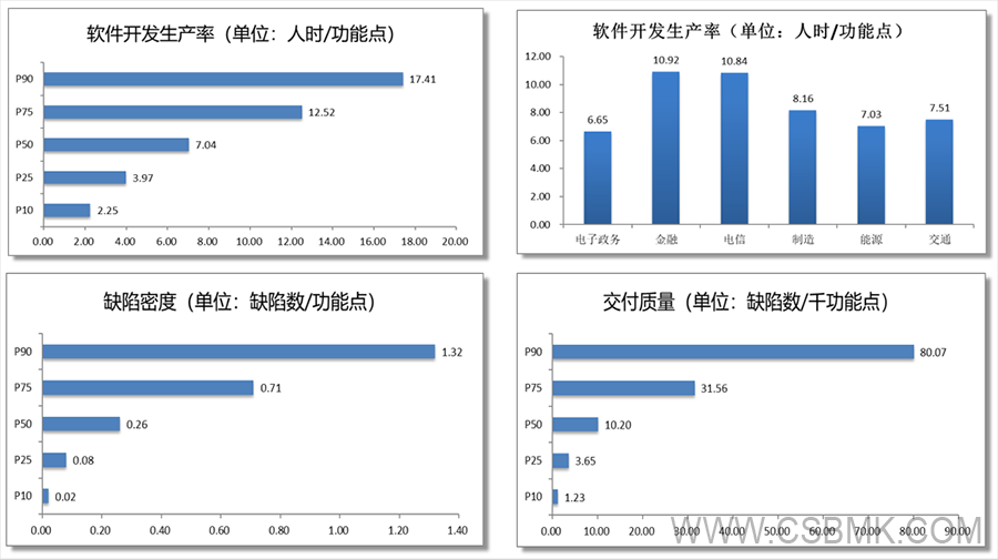 質(zhì)量:近五年來(lái),缺陷密度數據穩中有降,交付質(zhì)量穩步提升,2021年度全行業(yè)缺陷密度P50值為0.26個(gè)缺陷數/功能點(diǎn),交付質(zhì)量P50值為10.20個(gè)缺陷數/千功能點(diǎn)。