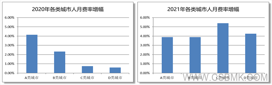 二、C、D類(lèi)城市人月費率增幅明顯擴大,增幅高于 A/B 類(lèi)城市