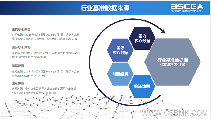 行業(yè)基準數據庫中的數據除了來(lái)自國內、國際的核心數據外,為了保證行業(yè)基準數據的客觀(guān)性和可靠性,還會(huì )使用大量的驗證數據和輔助數據用于交叉驗證及對行業(yè)數據進(jìn)行校正。2021年度基準數據使用的用于人月費率測算的輔助樣本達到了344545 個(gè),使用的驗證數據包括了國內企業(yè)咨詢(xún)及第三方評估高可信度數據 43765 套(包含運維項目數據 5480 套)。
