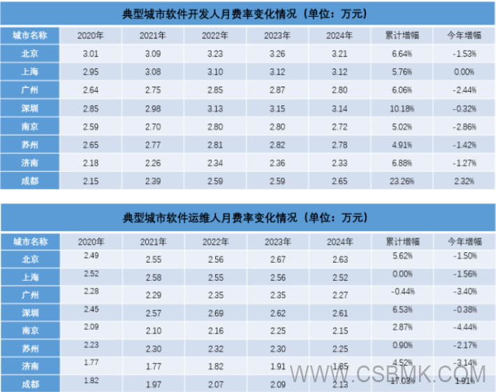 各地人月費(fèi)率數(shù)據(jù)整體呈現(xiàn)增長(zhǎng)態(tài)勢(shì),但近三年來(lái)各類城市人月費(fèi)率增幅明顯放緩。從2023年開始,人月費(fèi)率出現(xiàn)負(fù)增長(zhǎng)的城市逐步增多。