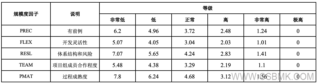 2:項目的規模經(jīng)濟性使用冪指數E來(lái)計算,取代了原來(lái)基本、中級和詳細COCOMO模型使用固定指數的方式,冪指數E由5個(gè)規模度因子計算得到。